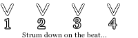 You will find that it is easy to keep in time when you strum down, but difficult to strum up on the half beat (in between each beat). Remember, try to keep the strums evenly spaced.