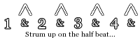 It is a simple idea, you strum down on the beat, then up on the half beat, this is shown by the "&" symbol. For now, don't worry about playing a chord, just place your fretting hand (the hand that plays the chords) on the strings as shown in the photo below.