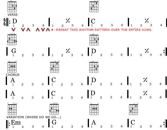 This is a simplified version of the song When Guns & Roses play it, they use 5th chords in the chorus and also insert a "B 5th" before the "C". Sheryl Crow also did a version but she varies some chords which makes her version a little difficult at a beginners level.