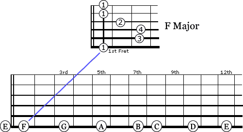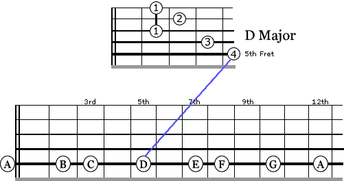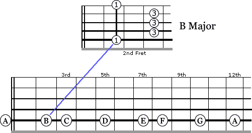 If you were to play this “E” shaped bar chord from the 5th fret you would be playing an A Major chord. If you were to play it from the 7th fret you would be playing a B Major chord, it is as simple as that.