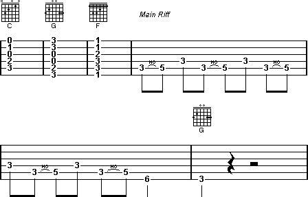 For the beginners: you'll most probably have trouble with hammering (represented by the HO on the tab) in the intro riff. To play it correctly you have to lay your 1st finger across the 5th and 4th strings and hammer with your 3rd finger on the 5th string. Make the notes flow evenly one after the other like this, 123123123123123 (listen to the midi). Most students when playing this song, play quicker on the hammer notes, so it comes out sounding like 12 3 12 3 12 3 (say this with a slight pause where the spaces are).