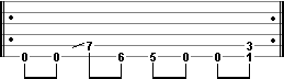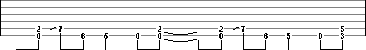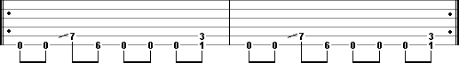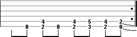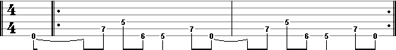 Play the main riff (between the repeat signs below) through 2 times. The bar before the main riff is just finishing the progression above for the 8th time through. As you can see the main riff starts half a beat early again. This is the riff that everyone knows. Make sure you use the correct fingers, roll your mouse over the image below to show the correct fingers to use.