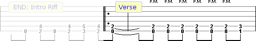 Enter Sandman - Verse & ChorusBecause most riffs in this song come in half a beat early rather than on the 1st beat of the bar there are repeat signs in places you would normally not have them. For example the "Verse" riff starts half a beat early and then repeat comes in half a beat early. Take note of the palm muting in the verse (P.M.). Palm muting is where you place the underside of the palm of your hand on the strings near the bridge with your picking hand. This will deaden/mute the sound of the note.