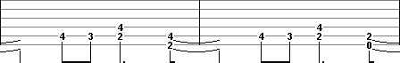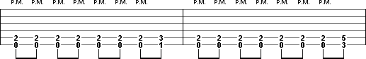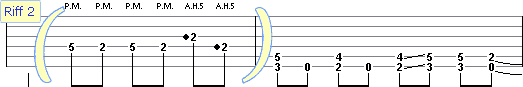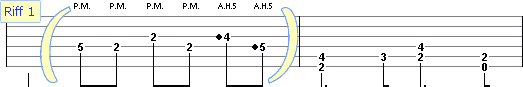 At the end of riff 1 & 2 there are artificial harmonics played (A.H.5). These are a high pitch squeals made by fretting the notes normally and the harmonic is produced by adding the edge of the thumb to the normal picking attack. A high volume of distortion will allow for a greater variety of harmonics.