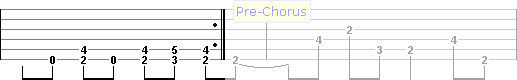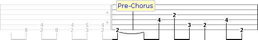 When playing the Pre-Chorus (or any riff in this song except the 1st intro riff) don't leave your fingers down, you want to sound out each note as a single note, not chords (don't be lazy). Use common sense when it comes to finger positions, this riff is played over a 3 fret span so obviously use you 1st, 2nd & 3rd fingers. Start the pre-chorus riff off with your 1st finger.