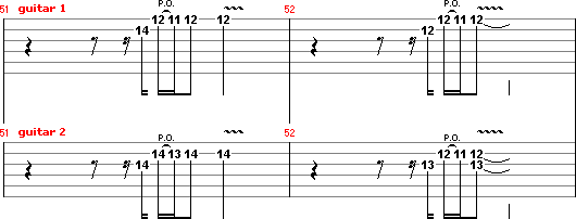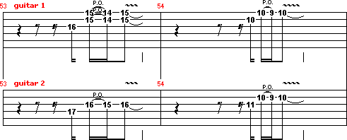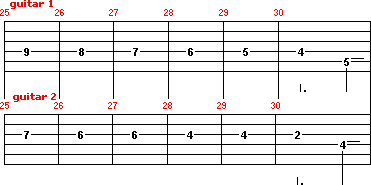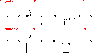 Distorted Harmony Lead GuitarsThese are two electric distorted guitars harmonising through the 2nd half of the 1st & 2nd Verse. You can't play both these parts together on the one guitar and get the same sound. They have to be played by two guitarists going through two separate amps.