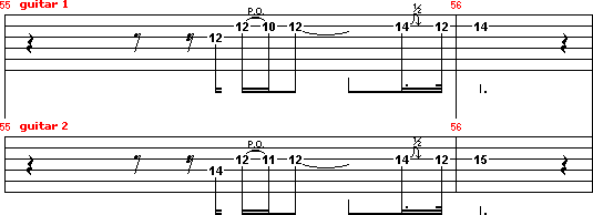 The next riff uses harmony notes again. A simple way to explain harmony notes is that it's the same riff but played either higher or lower than the main riff. There is a lot more to it than that of course, you have to know the key of the songs/solo and use either a 3rd or 5th above as a standard.