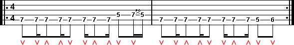 This part of the song is normally done with the bass guitar, it plays over the top of the previous riff. If you have a friend who also plays the guitar you can play both parts together, or just use the midi example above while you play the riff below.
