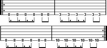 Wes Borland, the guitarist from Limp Bizkit plays a 7-string Ibanez UV7 guitar like the boys from Korn. He also uses a washburn guitar strung with one bass string and 3 guitar strings. Since the average learner doesn't own this type of gear this following example has been adapted to a standard 6 string electric guitar. In the last two riffs you have to drop the thick E string down to a lower D note, learn how to do this in the "Drop D Tuning 5th chords" section.