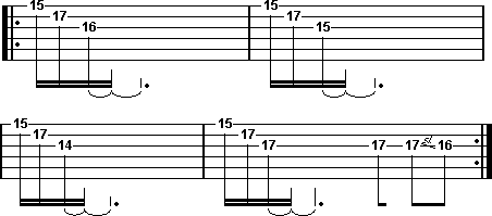 Some common mistakes I've seen when teaching this part of the song is students leaving their fingers down and treating this riff like a chord. Make sure you only have one finger down at a time, play the 15th fret on the 1st string then the 17th on the 2nd string, don't leave the 15th down, lift it off. Do the same when you play the 16th fret on the 3rd string, make sure you lift off the 17th. This will produce a nice clear note sound with no overlapping overtones.