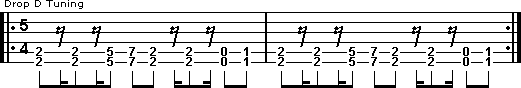 Once again this is drop D tuning, listen to the midi examples to get your timing. Notice the 16th note rests between the notes, the first two notes are cut short by the rests in the middle of them, you do this by lifting your fingers off the frets but not off the strings. Take note of the 5/4 timing as well, it sounds like it's going out of time, but it all comes together in the end.